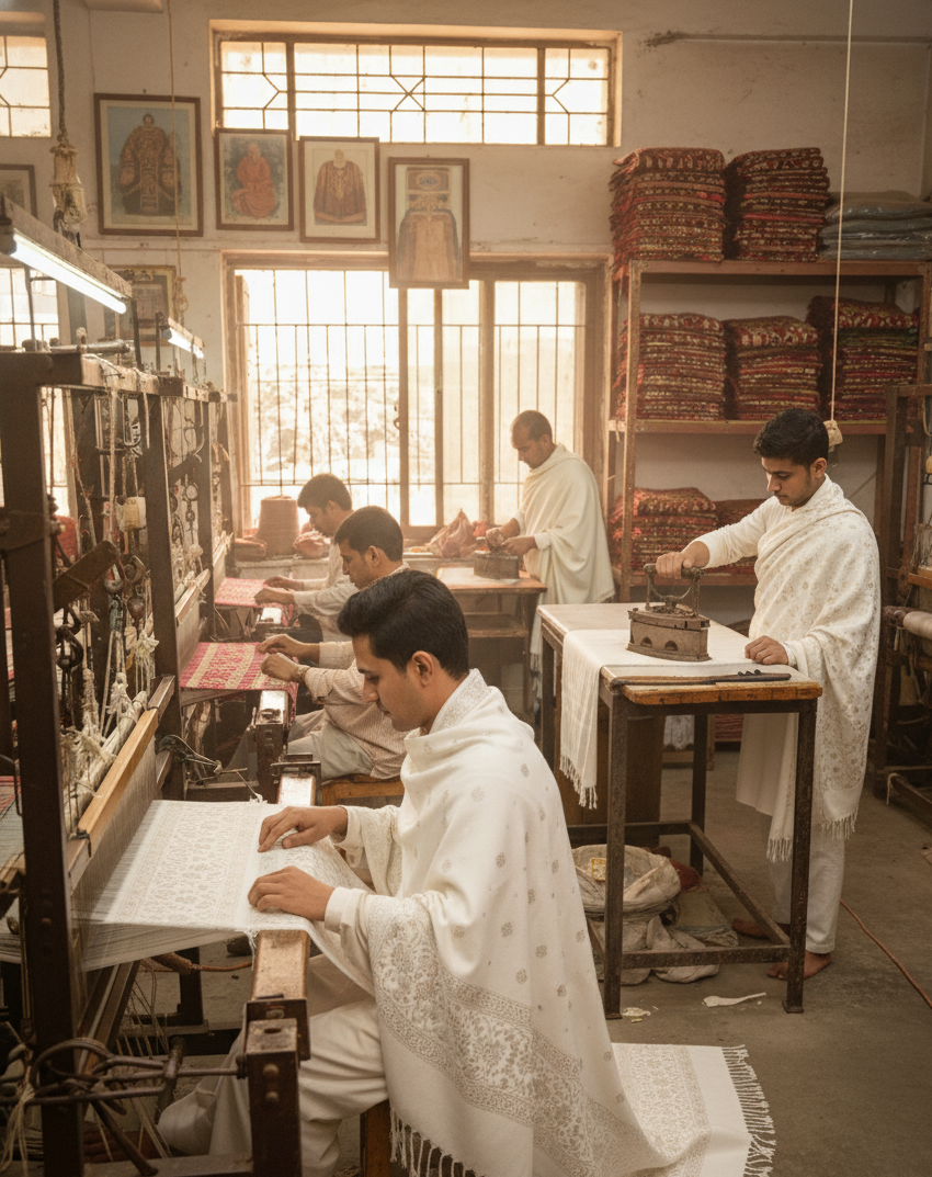 • Handloom Weaving: Each shawl is meticulously handwoven on traditional wooden looms (known as ‘khaddi’ or ‘gada’), a process that creates a superior, durable, and uniquely textured weave that cannot be replicated by machines.