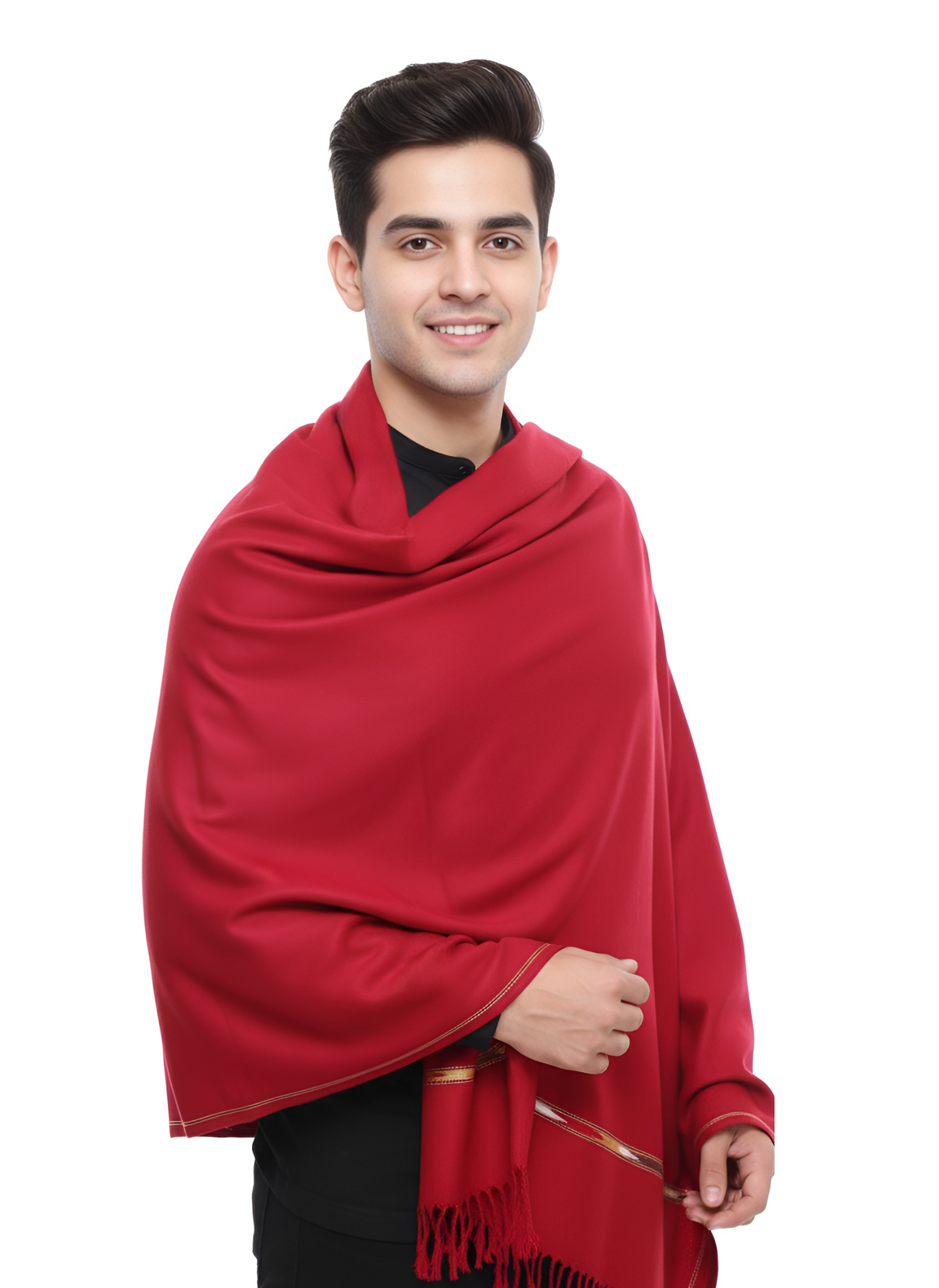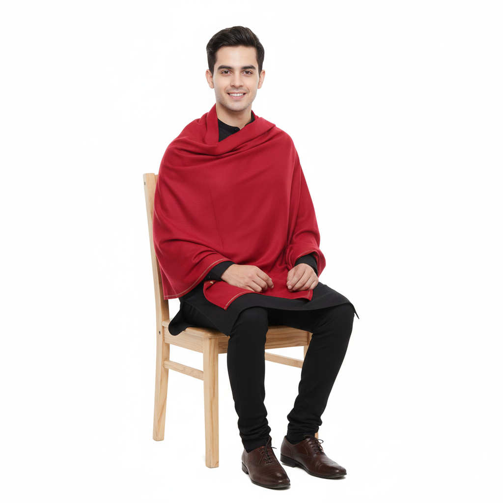 A deep, majestic maroon shawl in luxuriously soft wool. The solid color and elegant drape make it a timeless statement piece. Essential for formal occasions, weddings, and cold-weather sophistication.